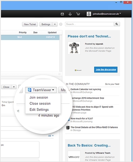 Remote support tool TeamViewer is now integrated with IT Help Desk service combined with IT community Spiceworks. From now users (support agents) are able to create and join support sessions directly from the Spiceworks help desk. Customers can connect with a simple click. An overview of current Spiceworks sessions is available in the TeamViewer Management Console and TeamViewer client. Connection reports are added to the corresponding ticket. Spiceworks is used by more than 5 million IT professionals to connect with one another, manage technology environments and learn about the latest technology products and services.