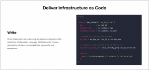 Write infrastructure as code using declarative configuration files. HashiCorp Configuration Language (HCL) allows for concise descriptions of resources using blocks, arguments, and expressions.