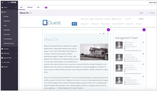 dotCMS, a leading open-source Java CMS and Customer Experience Management software vendor, has launched their latest version, dotCMS 5.0, adding UI / UX features to improve the author experience, a refreshed Edit Mode, new reporting, as well as enhancements to search and security. Layouts are now tied to the page itself, making it easy to make changes to the layout without having to leave the page editor. New Workflow Builder allows for multiple workflow schemes per content type. Content Type Builder allows drag and drop from a list of fields to build out content types. Adding rows, columns, and changing the order of fields makes it easier to build out new content types, especially forms. A huge improvement to the usability of the platform, containers can be used multiple times on the same page, leading to the decrease in the number of templates and the overall ease of management of templates, layouts and containers. Along with these new drag-and-drop features, dotCMS 5.0 also includes a new reporting module that integrates with Google Analytics to allow businesses to gain insight into their website right from the dotCMS Dashboard. This visualization of your web properties can be customized to show what insights are most important to your business.